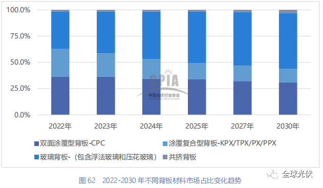 目前,市场上使用的背板主要包括双面涂覆型、涂覆复合型、玻璃及共挤型背板。2022 年,双面涂覆型背板及玻璃背板占行业主流,占比均超过 35%,其次是涂覆复合型背板,市场占比约26.7%。但未来几年,随着双面发电组件市场占有率不断提升,玻璃背板和透明有机背板占比将随之增长。