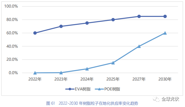 树脂粒子主要包含 EVA 树脂粒子和 POE 树脂粒子。2022 年,我国已有多家企业可实现 EVA粒子的量产,在地化供应率已基本达到 60%左右。在未来光伏行业及其他行业的需求驱动下,2027 年我国 EVA 粒子在地化供应率或将进一步提升至 85%以上。