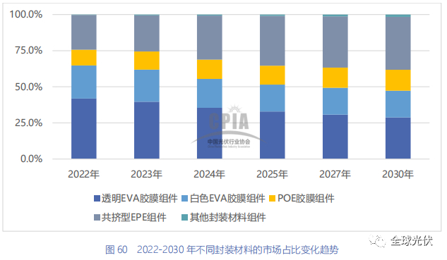 2022 年,单玻组件封装材料仍以透明 EVA 胶膜为主,约占 41.9%的市场份额,POE 胶膜和共挤型 EPE 胶膜合计市场占比提升至 34.9%,随着未来 TOPCon 组件及双玻组件市场占比的提升,其市场占比将进一步增大。