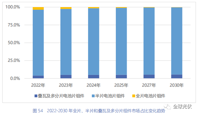 2022 年,半片组件市场占比为 92.4%。由于半片或更小片电池片的组件封装方式可提升组件功率,预计未来其所占市场份额会持续增大,到 2030 年预计将增长至 94.2%。