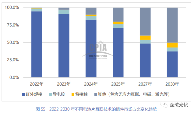 2022 年红外焊接技术为市场主流焊接技术,市场份额约 94.6%;导电胶互联主要应用在叠瓦组件中,市场占比约 4%;背接触互联主要应用在 XBC 和 MWT 组件中,市场占比约 0.4%;无应力互联技术主要应用在异质结电池中,2022 年市场占比约 1%。