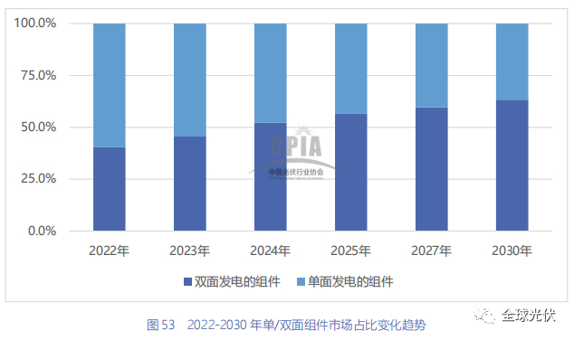 2022 年,随着下游应用端对于双面发电组件发电增益的认可,双面组件市场占比达到 40.4%。预计到 2024 年,双面组件将超过单面组件成为市场主流。