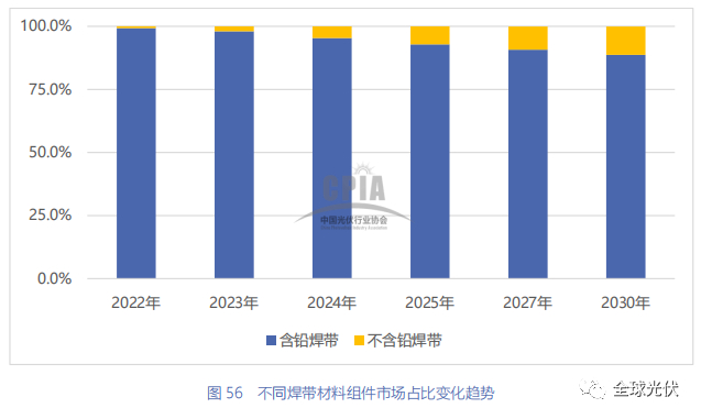 焊带材料主要分为含铅焊带和不含铅焊带两种。含铅焊带具有成本低、焊接可靠性高、导电性好等优势,仍为当前主要使用的互联方式。2022 年其市场占比达到 99.3%。欧洲等部分国家及地区出于对环保的考虑,要求组件使用不含铅焊带,2022 年市场占比仅为 0.7%左右。