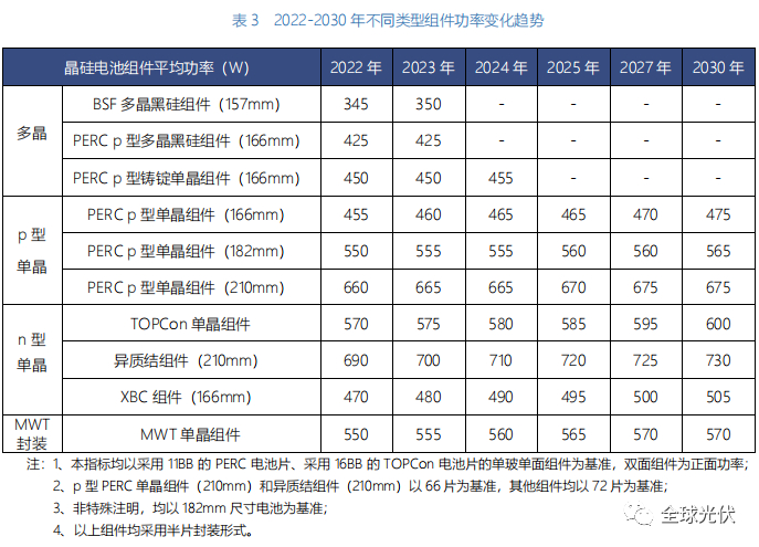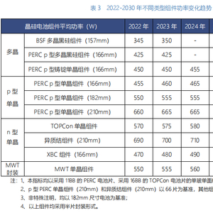 2022 年,常规多晶黑硅组件功率约为 345W,PERC 多晶黑硅组件功率约为 425W。采用166、182mm 尺寸 72 片 PERC 单晶电池的组件功率已分别达到 455W、550W;采用 210mm 尺寸 66 片的 PERC 单晶电池的组件功率达到 660W。采用 182mm 尺寸 72 片 TOPCon 单晶电池组件功率达到 570W。采用 210mm 尺寸 66 片异质结电池组件功率达到 690W。采用 166mm 尺寸 72 片XBC 单晶组件功率达到 470W;采用 182mm尺寸 72片 MWT单晶组件功率达到 550W。