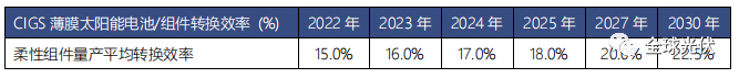 量产的玻璃基 CIGS 组件(面积为 1200╳600mm2)最高转换效率约 17.6%,平均转换效率(面积为 1200ⅹ600mm²)约 16.5%。柔性 CIGS 小电池片(≥1cm²孔径面积)实验室最高转换效率为 21.7%,柔性 CIGS 组件(≥0.5 m²开口面积)最高转换效率为 18.6%,量产平均转换效率 15%。