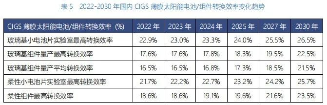 铜铟镓锡(CIGS)薄膜太阳能电池,一般采用玻璃材质衬底,也可以采用柔性衬底(如不锈钢箔等)。2022 年我国玻璃基 CIGS 小电池片(≥1cm2孔径面积)实验室最高转换效率为 22.9%。