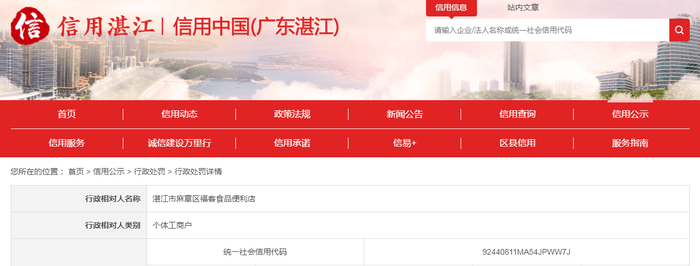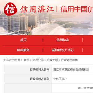| 行政相对人名称 | 湛江市麻章区福客食品便利店 | ||||