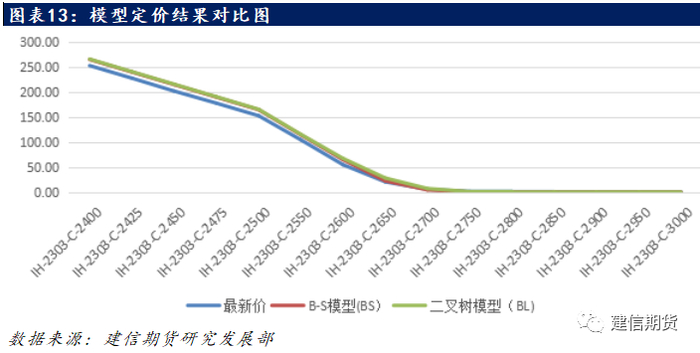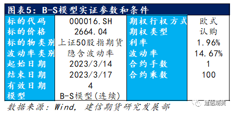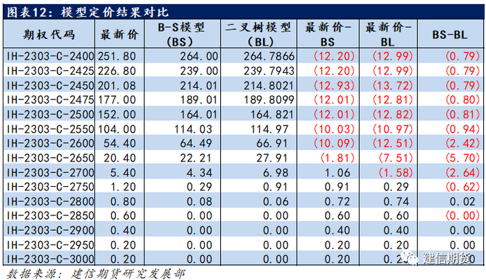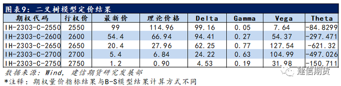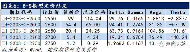 以中金所的上证50股指期权为例,假设当前标的物价格为2664.04元每手,其平值认购期权为IH-2303-C-2650,B-S模型给出的理论价格略高于市场价格。值得注意的是虚值期权的理论价格略低于市场价格(以行权价为2700和2750为例),而实值期权的理论价格略高于市场价格(以行权价格为2600和2550的认购期权为例)。