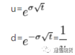 1.在每次做分叉路径的时候都假设资产价格会向上移动的概率为u或向下移动的概率为d(u小于等于1,d处于0和1之间),如果当前价格为S,则向上移动价格为S*u,向下移动价格为S*d。价格移动的幅度取决于标的资产价格波动率以及每一步时间长度t(以年为单位),则: