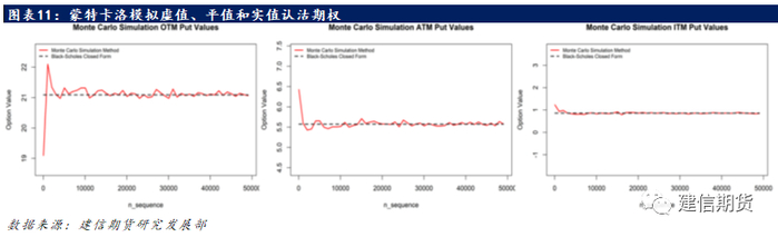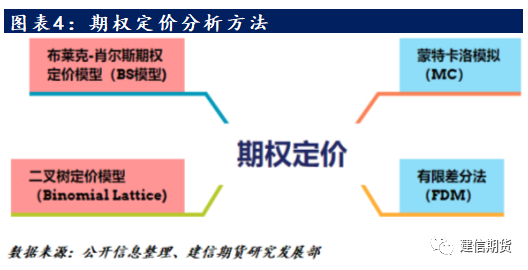 目前备受关注的期权定价模型如图中所示,本文将涵盖其中最著名的Black-Scholes期权定价模型(B-S模型)、二叉树定价模型(Binomial Lattice)和蒙特卡洛模拟(Monte Carlo),并通过计算分析其定价结果。BS模型最早是由 Fischer Black和 Myron Scholes于1973年提出的,这个模型对于欧式期权给出了具体数学公式的解析表达式,时至今日此模型仍为投资者广泛使用。B-S模型更多地适用于欧式期权,而且在定价理论上存在着一系列的严格假设。当投资者不能完全满足更严格的假设条件时,B-S模型也无法给出更精确的定价。在这一背景下,罗斯,考克斯和马克·鲁宾斯坦于1979年提出了一种较为简单的二叉树期权定价模型。该模型假定股票价格的波动方向可分为升或降,而每一次波动的波动性和波幅是恒定的。该模型将整个存续期划分为几个阶段,以标的资产价格的历史波动率为依据,模拟出正股在整个存续期内的可能发展路径,并计算每条路径上的每一个节点,使用期权的行权收益,利用贴现法计算权证的价格。如果是美式期权,由于可以提前行权,每一节点上权证的理论价格应为权证行权收益和贴现计算出的权证价格两者较大者。上述两个模型更适合于结构比较简单的期权产品,而对于一些比较复杂的期权产品,则需要使用蒙特卡洛模型,因为这个模型可以通过多次模拟价格的变化,从而更精确的定价路径依赖型期权。
