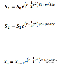 在风险中性测度下模拟标的资产价格 S 的路径。有效期分为 n 个间隔相等的时间段Delta_t = T/n 。对于GBM来说可以获得S的如下分析表达式: