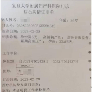 丁女士提供的产检资料显示,2月27日、28日,丁女士在复旦大学附属妇产科医院特需门诊产检,被两位不同的医师诊断为:高龄初产,妊娠高血压,需高危妊娠监督?两次的复查记录单上,都打印着“休28天”的字样。