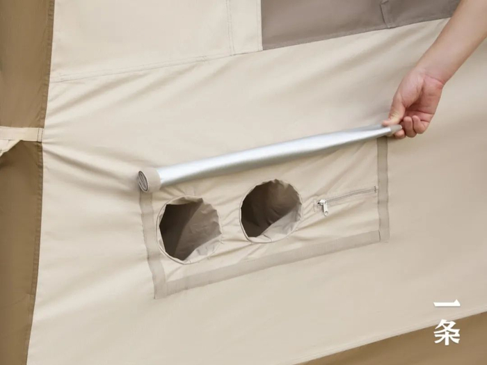 窗户用魔术贴固定,撕开后会露出一个小支撑杆,把窗户撑起来,增加帐篷透气性。