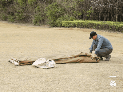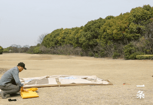 放完气后,不要挪动帐篷的位置,先叠没有排气阀的一侧,再叠有排气阀的一侧,叠成三层,再像卷被子一样从一侧卷向另一侧。