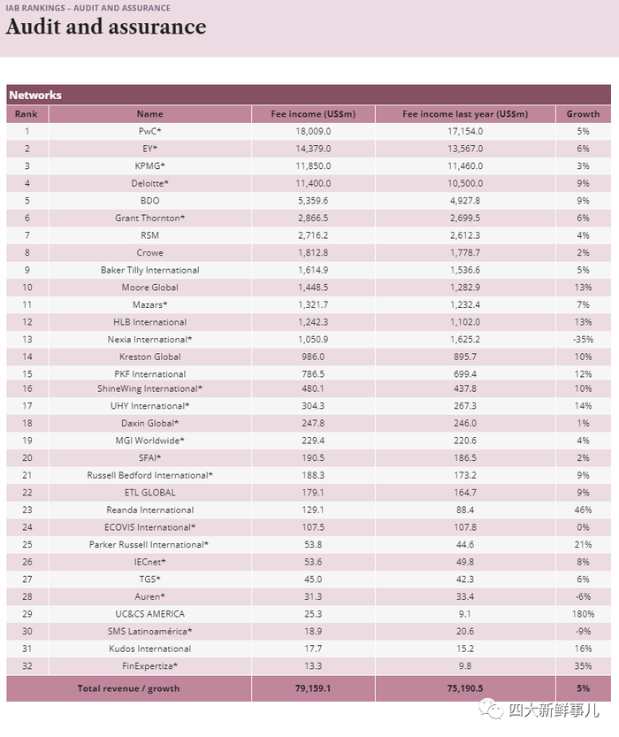 国际会计网络审计及鉴证业务收入排名如下: