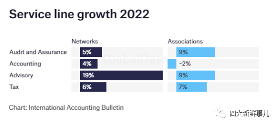 22财年,国际会计网络的咨询业务发展迅猛,全球增长率达到了19%。虽然会计业务仍然排在最后,但它的正增长率为4%。 审计及鉴证服务和税务服务的增长率分别为5%和6%。