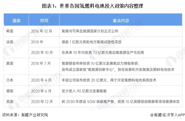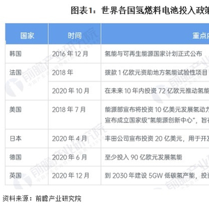 作为新能源的一种,氢燃料电池因效率高、环境友好、噪音低等特点而受到了各国政府及企业的关注,近年来,世界各国纷纷出台相关政策,积极布局氢燃料电池技术。