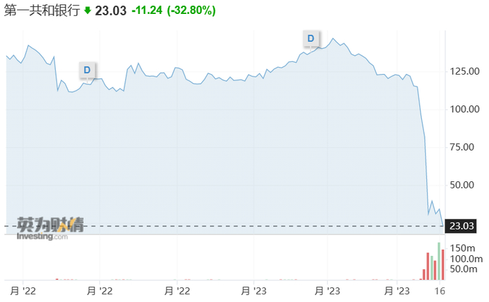 上周五,第一共和银行的股价又暴跌32.8%,至每股23.03美元,这反映出投资者担心这家银行未来还会面临更多麻烦。