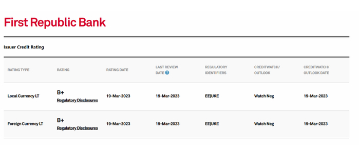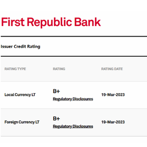 周日,标普将第一共和银行的信用评级从“BB +”下调三个级至“B+”,并警告有可能再次下调该行的评级。