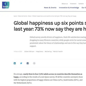 近日,国际知名民调机构益普索集团(Ipsos)发布了一份有关全球幸福指数的调查报告,结果显示,在32个国家中,幸福感指数最高的国家是中国(91%),其后是沙特阿拉伯(86%)和荷兰(85%)。