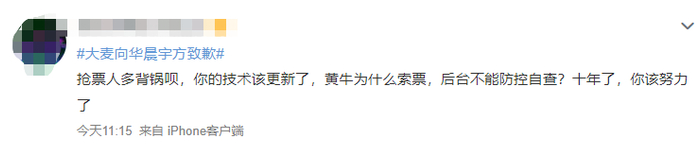 演唱会的火爆,也给了黄牛可乘之机,据红星新闻了解,此前浙江海宁一女生在网上看到有人出售华晨宇演唱会的门票,经沟通后,她给对方转过去379.2元。没想到对方以付款未备注为由要求重新支付,并表示第一次的付款会自动返还。女孩连续付了3次,合计金额约1140元,对方仍让她继续转账后,她这才意识到被骗。还有一些乐迷,也晒出自己或朋友被骗的经历。
