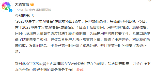 3月19日,演唱会票务总代理大麦发布了一份致歉声明。声明中表示,在“2023华晨宇火星演唱会-成都站5月1日场”预售期间,用户持续增加,流量倍增,同时发现有大量黄牛通过非法手段企图刷票,系统自动提高了防刷票安全级别,导致部分用户无法正常支付下单。发现问题后,平台已第一时间做了紧急处理,并且在第一时间恢复了系统正常。对此次演唱会合作过程出现的问题,大麦“深表歉意”。