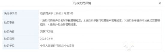 据2022年3月11日中国人民银行石家庄中心支行的处罚决定书显示,上海汇付支付有限公司石家庄分公司因违反特约商户实名制审核管理规定、违反收单银行结算账户管理规定、违反收单业务本地化经营管理规定、.违反外包业务管理规定等四项行为被罚77万元。