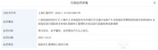 在2021年年末,汇付支付曾因违反规定将外汇汇入境内、未按规定在合作银行开立备付金账户等5项违规行为被国家外汇管理局上海市分局罚款447万元。