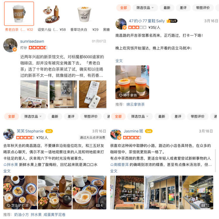 Evan说,第一家开吉茶馆2022年7月30日开门营业的同时,在大众点评也上线了门店,包括收银系统同步上线。去年最火的“围炉煮茶”,消费者也可以在大众点评上预约。茶馆里,32元的拌水果,是网友推荐的top1;用酒瓶子装的南糯普洱冰极萃,也让年轻人眼前一亮。茶馆里十年的煮老白茶,网友说:有药香,有蜜韵。平台上的这些评价,都成了开吉茶馆日常运营的反馈。