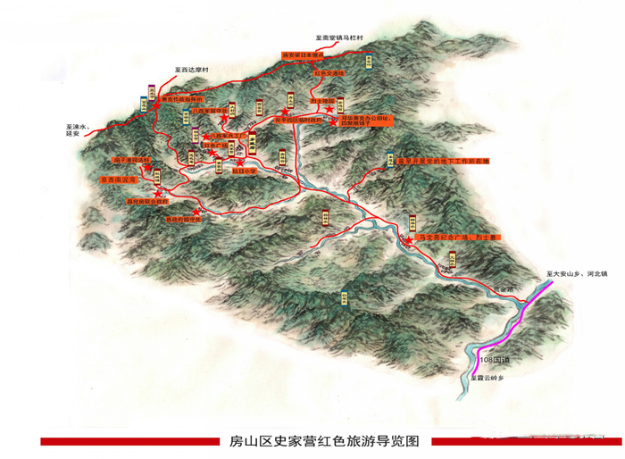 房山区史家营乡曾是平西抗日革命根据地的重要组成部分,红色资源丰富,可以说村村有抗战烈士、家家有英雄故事、到处是抗战遗址。2022年,圣莲山、百花山、百瑞谷三大景区以及金鸡台村,被北京市文化和旅游局评定为市级红色旅游景区。