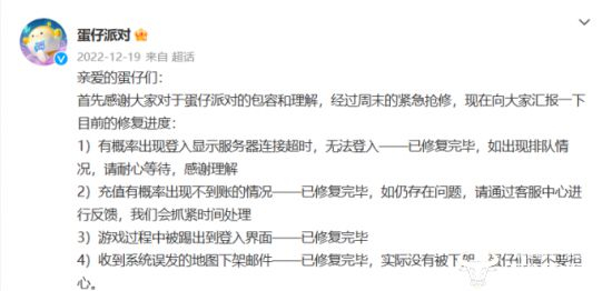 而后,在12月19日《蛋仔派对》官博发文汇报修复进度,表示相关问题已修复完成,并表示将持续投入人力继续优化服务器。