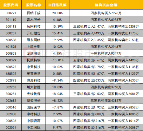 买入方面,电商股青木股份获机构买入近7000万;游戏股顺网科技获机构买入2.47亿;跌停的用友网络获机构买入3.35亿抄底,同时遭机构卖出2.53亿;一带一路概念股龙建股份获机构买入超9000万。
