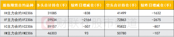 四大期指主力合约多空双方以减仓为主,其中IH、IF、IC合约空头减仓数量均大于多头;IM合约空头减仓,多头小幅加仓。从期指增减仓动作来看,多头占据一定优势。