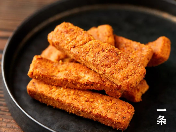 这款黄金馕片,精选天山优质小麦制成的馕饼,切条后经炸、烤、拌料等9道工序制作而成。