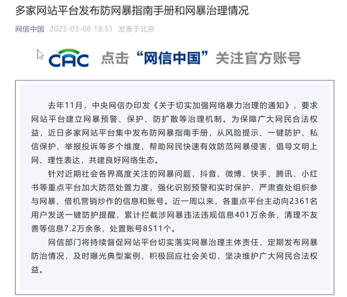 中国政法大学传播法研究中心研究员朱巍表示,平台应该实现“一键防护”功能,使受害者与网暴的评论、私信有效隔绝。