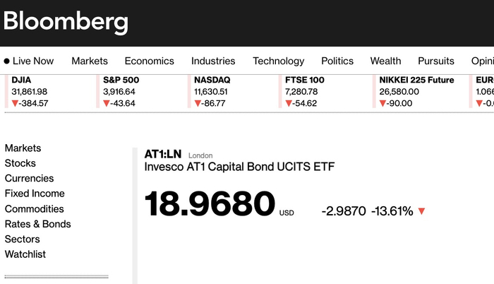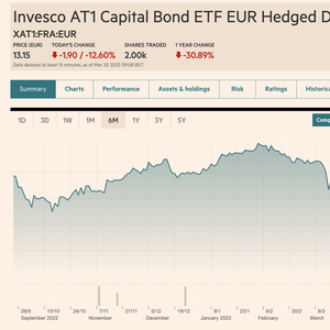 截至北京时间周一17:40, 景顺AT1资本债券ETF(Invesco AT1 Capital Bond UCITS ETF)大跌13.61%。