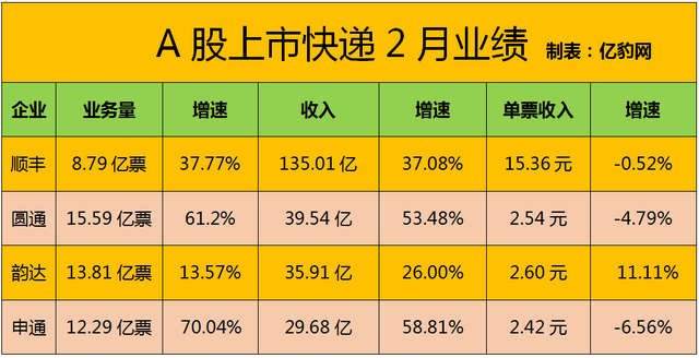 上市快递企业相继发布的2月经营业绩显示,四家快递量收均实现不同程度增长,此消彼长的竞争环境下,伴随传统淡季来临,局部地区价格战再燃战火。