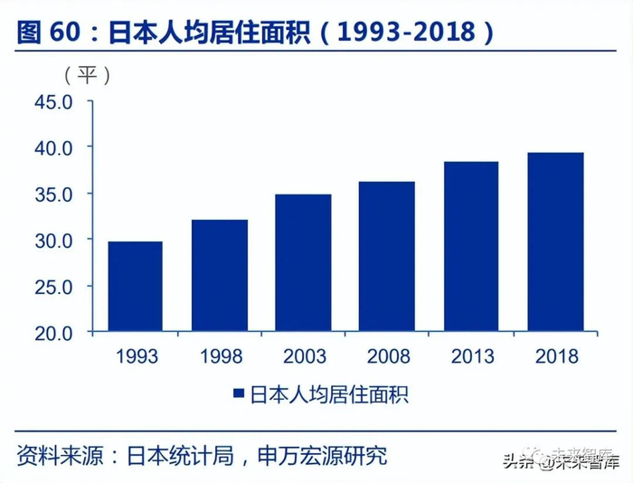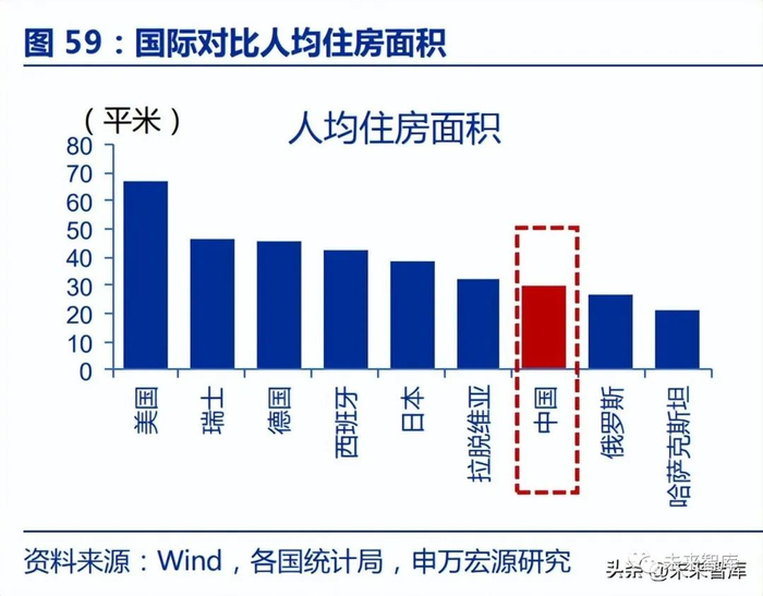 3)人均住房面积方面,日本在 1993 年是 29.8 平,逐步提升至 2018 年的 39.5 平, 城镇化率缓慢增长的阶段仍有每 5 年增长 6%。考虑到我国统计口径均为建筑面积,而对比 海外国家口径均为实际使用面积,因而谨慎按照 85%得房率(按照浙江省七普数据和统计 年鉴数据,估算目前存量得房率约 84%)估算,目前我国实际人均居住使用面积仅为 30.3 平,显著低于日本的 39.5 平、德国的 46.0 平、瑞士的 46.6 平、美国的 66.9 平。