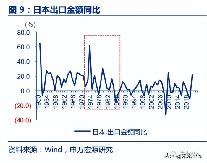 两次协议导致跨国资金流入:日本属于外向型经济国家,为了防止本币升值对全国经 济增长带来不利影响,日本央行制定一系列宽松政策刺激经济增长。因此,日本跨国资金 回流以及海外资金流入也促进了国内市场繁荣。日经 225 指数也从 1950 年的 110 点提升 至 1975 年的 3,837 点,对应 CAGR15%。出口下行:1985 年的日元大幅升值使日本出口在 1986 年初受到了一定冲击,1986 年日本出口金额同比大幅降至-16%、GDP 同比放缓至 3.2%,经济出现短暂衰退,被称为 “日元升值萧条”;1985-1990 年出口金额平均增速 0.3%,对比 1970-1985 年平均增速 14.1%出现了大幅下降。