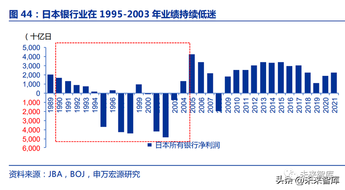 坏账计提滞后:一方面,日本银行本在 90 年代采取的是历史成本法而不是公允价值计 量金融资产,因此 1995 年之前在通过处置早期购入的金融资产产生的处置收益对冲利润下 行。另一方面,大藏省在 1992 年才首次对不良债权进行统一规定,1995 年 7 月才首次宣 布按照国际通行标准披露日本银行业的不良资产为 50 万亿日元,自此银行业不良贷款比例 逐步攀升至 2002 年的 8.4%。1995 年日本银行业出现首次亏损、达到-3.7 万亿日元,后 续直到 2003 年才逐步走出低谷,期间业绩合计亏损 21 万亿日元。