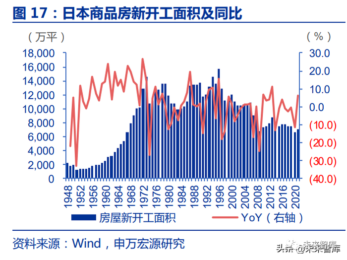 因此,在股市崩塌、持续加息、金融机构房地产贷款限制以及地价税出台的共同作用 下,日本房地产泡沫开始破裂,并开启了“失去的 20 年”的经济下行通道。1)开工方面,2009 年低点较 1990 年高点-57%。1990 年日本新开工住宅户数达到 峰值 171 万套,其中自有(买地自建)、租赁、新建待售(类似中国的商品房)分别占比 29%、47%和 22%,因此当时对应的商品房新开工户为 38 万套。新开工面积在 1996 年 达到峰值 1.6 亿平,后续逐步下行,在 2009 年达到最低点 0.7 亿平、较高点-57%。