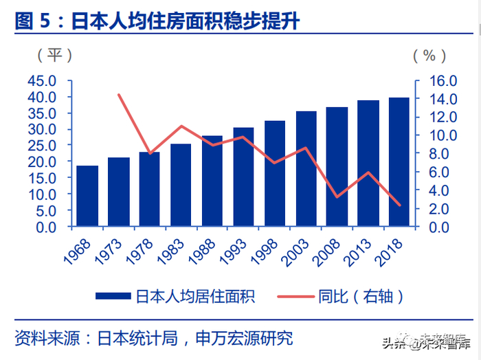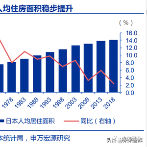 2) 人口情况:从自然人口增速来看,1950-1975 年平均增速 11.55‰,1976-1990 年均值降至 6.49‰,1991-2006 年继续下降至 1.77‰,后续人口增速持续为负。从人口结构来看,65 岁以上人口占比从1960 年的5.6%提升至1985 年的10.1%, 后续基本以每年 0.4-0.5pct 的增速持续提升至 2021 年的 28.7%;90 年代以来, 日本人口增速大幅放缓、并且老龄化大幅加剧。3) 杠杆率:居民部门杠杆率从 1964 年的 20%提升至 1985 年的 52%,整体仍有加 杠杆空间;但非金融企业部门杠杆率从 91%提升至 108%,并在 1990 年前后提升 至 139%,企业杠杆率基本上也进入瓶颈期。4) 人均住房面积:日本人均居住面积从1968 年的18.7 平提升至1988 年的27.8 平, 也同样经历了快速提升,但整体仍有一定的提升空间。