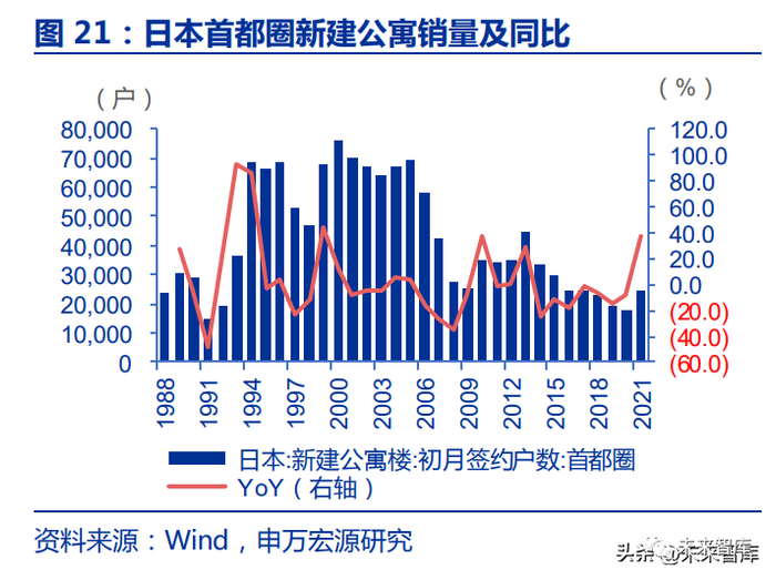 2)供给方面,2009 年低点较 1994 年高点-58%。供给套数在 1994 年达到峰值 19 万套,首都圈+近畿圈一般占比 70%以上,在 1992 年达到最低点 8 万套,销量小幅反弹 后开发商马上加大推盘。2009 年再次降至 8 万套、较高点-58%,后续供给套数基本在 8 万套左右徘徊。