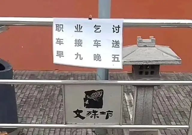 “职业乞讨,早九晚五,车接车送,日赚千元。”这是一张贴在成都文殊院景区门口的警示标语,网上流传的视频中,标语旁边是两名老人,一名拄着拐杖,一名双手有残疾,他们被形容是“职业乞丐”。现场工作人员称,标语并非文殊院所贴,而是文殊坊的物业制作的,主要目的是提醒游客、香客不要轻信行乞、算命人员,以免上当受骗。