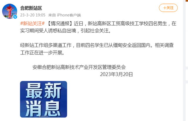 合肥新站区发布通报:四名男生实习期受人诱惑出境,目前已从缅甸返回