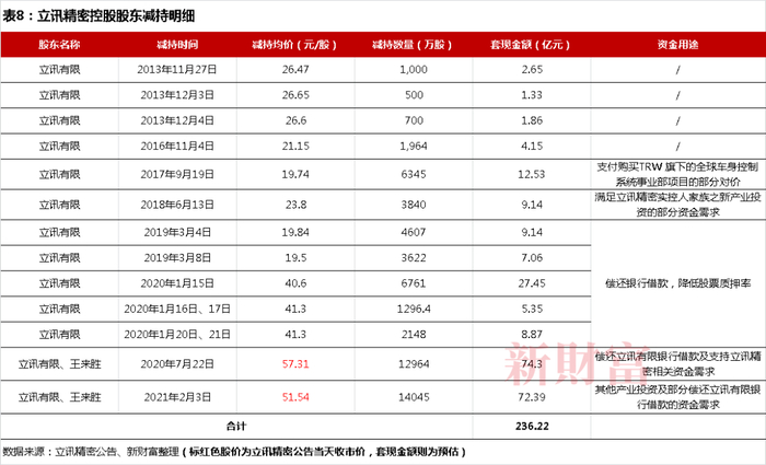 新财富经过统计,立讯有限以及王来春在立讯精密上市后,通过减持股份,累计套现金额超过236亿元(表8)。2020年7月和2021年2月,立讯有限和王来胜两次减持,合计套现金额或达146.7亿元,占套现总额的62%。