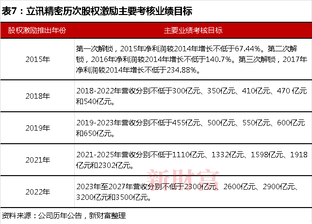 同时,根据立讯精密2022年度股票期权激励计划进行测算,其2024至2027年营收考核目标为年均增长11%,远远低于此前增速。