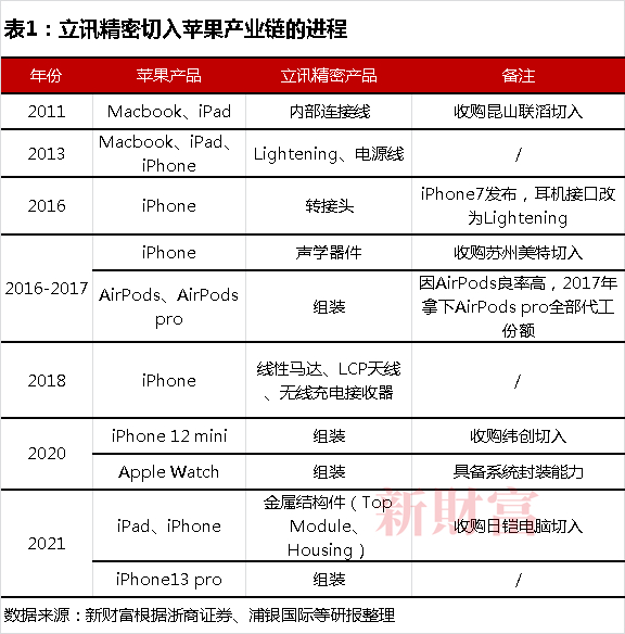 不知道王来春是否在创业初就将老东家作为赶超对象,如今,立讯精密至少在市值上已经超过了工业富联。在这一赶超过程中,业务上,立讯精密与苹果深度绑定,资本运作上,并购则为其做大做强发挥了重要作用(表1)。