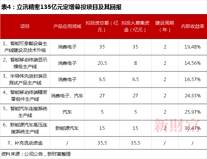 根据计划,立讯精密定增募集的135亿元,分成两大类用途:与消费电子有关的,占用资金额约66亿元(假设项目4有一半用于消费电子),与汽车有关的,或达33.5亿元,即产能提升耗资百亿元,此外,还会补充流动资金35.5亿元(表4)。