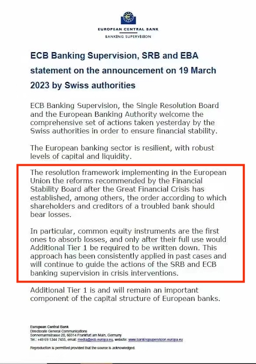 虽然瑞士不是欧元区国家,但欧洲银行股的恐慌也惊动了欧洲银行业监管。北京时间3月20日下午,欧洲央行(ECB)的单一监管机制(SSM)、单一处置机制(SRB)和欧洲银行业监管局(EBA)联合发布声明,强调银行的普通股应当是最先吸收损失的部分,只有在股权“充分使用”后才会减计AT1债券。
